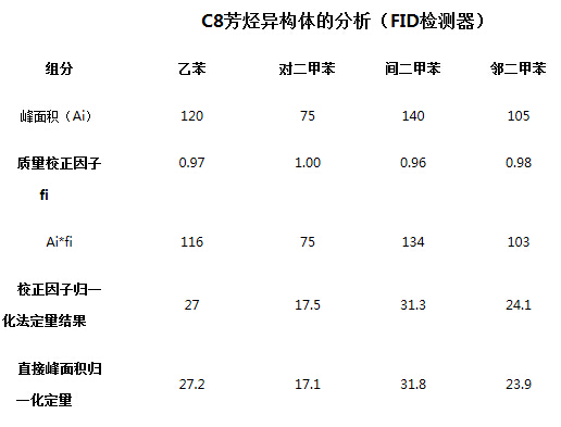 氣相色譜的一些主要檢測器如FID和TCD對(duì)某些組分,如同系物的校正因子相近或有一定的規(guī)律,從文獻(xiàn)中可以查到或進(jìn)行計(jì)算。當(dāng)校正因于相近時(shí),可直接用峰面積歸一化進(jìn)行定量分,例如下表中給出了C8芳烴異構(gòu)體的分析結(jié)果。四個(gè)組分的FID檢測器的質(zhì)量校正因子在0.96-1.00之間,結(jié)果給出了用校正因子進(jìn)行歸一化法的定量結(jié)果和直接用峰面積進(jìn)行歸一化的定量結(jié)果。