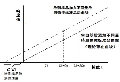 具體操作是取等量待測樣品若干份,加入不同濃度的待測組分的標(biāo)準(zhǔn)溶液進(jìn)行分析,以濃度為橫坐標(biāo),峰面積為縱坐標(biāo)繪制工作曲線。工作曲線延長線在橫坐標(biāo)上的截距即為樣品中待測組分的濃度。由于待測組分以及加入的標(biāo)準(zhǔn)溶液處在相同的樣品基體中,相當(dāng)于把待測試樣作為了背景值。