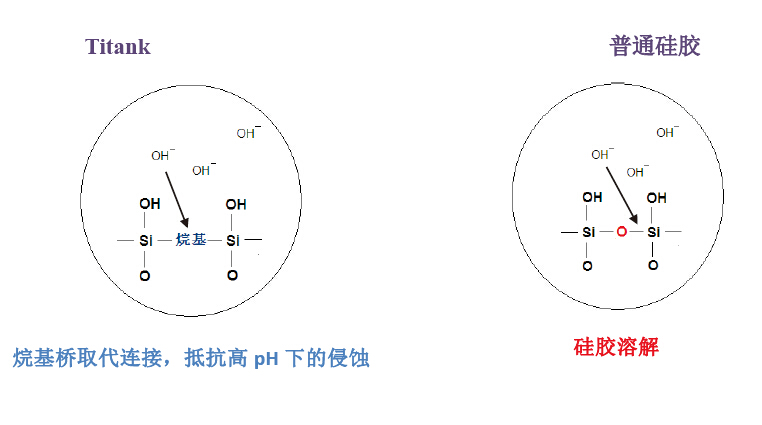 Titank 系列有機(jī)硅膠雜化基質(zhì),是在硅膠的硅氧烷網(wǎng)狀構(gòu)造中以更加穩(wěn)定的烷基來取代在堿性條件下不穩(wěn)定的硅氧橋連接,使其既具有硅膠類填料的良好分離性能和機(jī)械強(qiáng)度,又有聚合物填料的耐堿性。