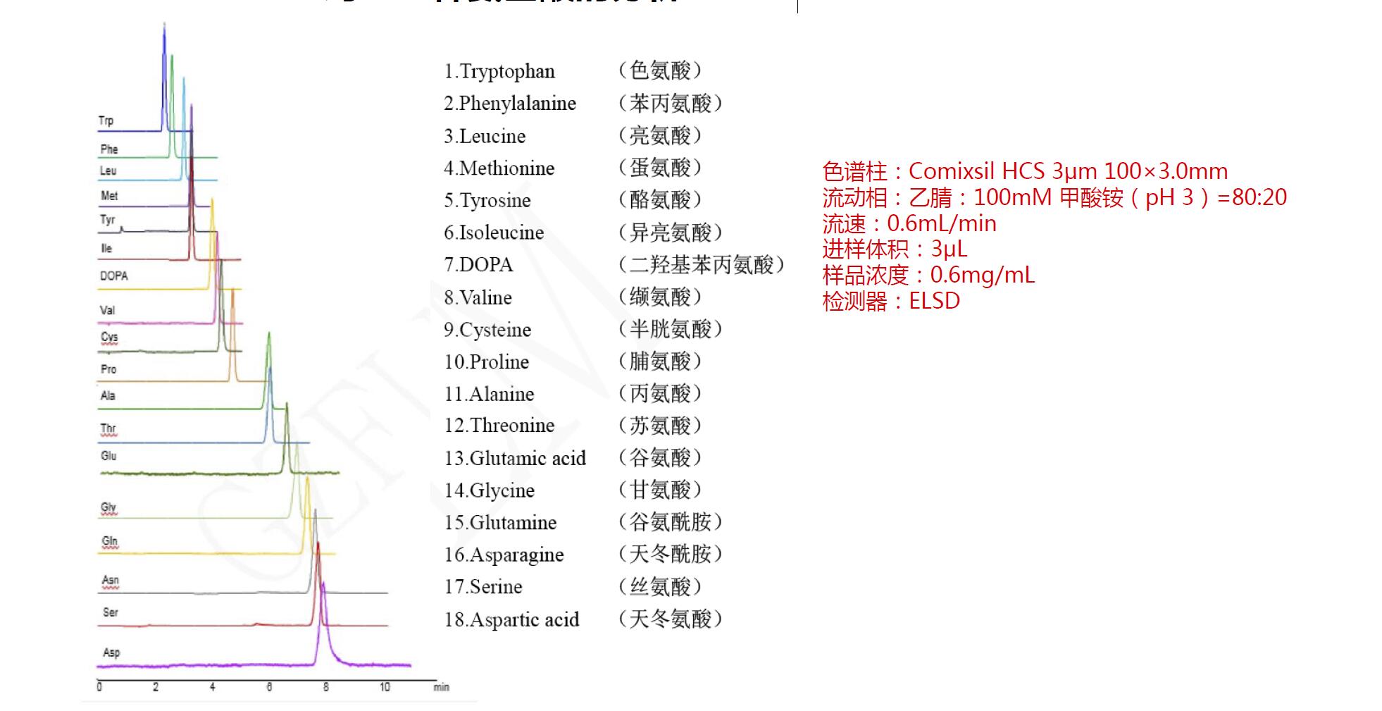 A、HPLC-UV PITC衍生分析法案例18種氨基酸