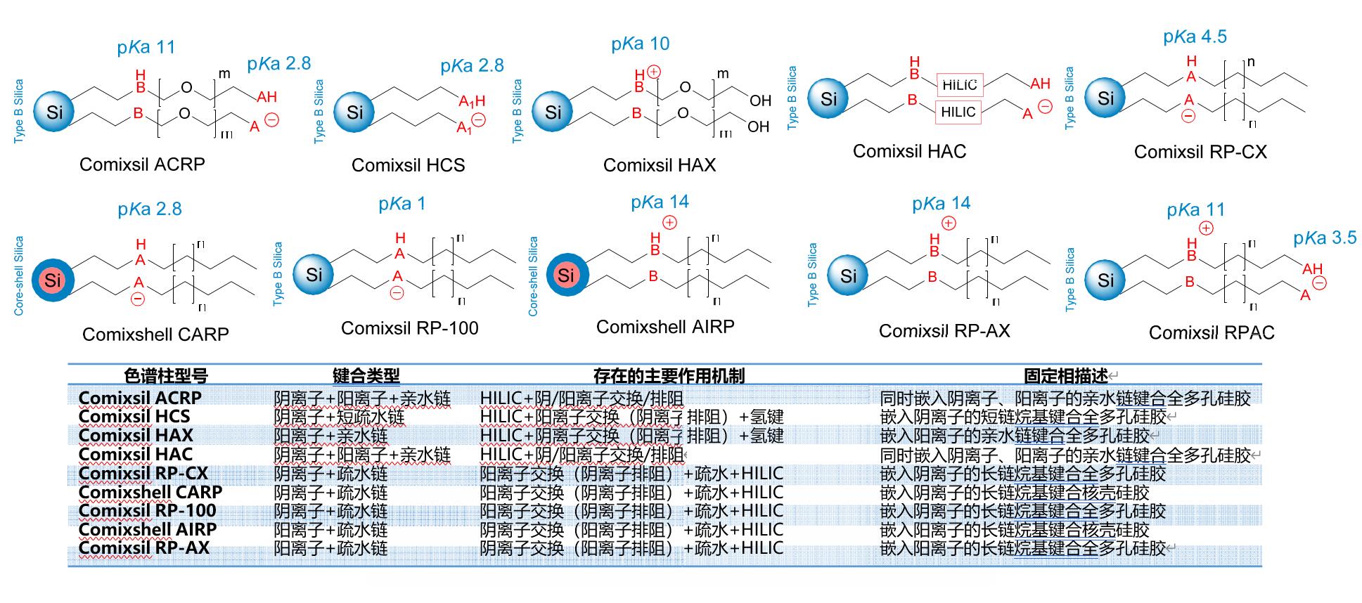 菲羅門公司的Comix系列為創新的混合作用(Mixed-mode)液相色譜柱,通過在疏水的碳鏈或者親水鏈上嵌入離子基團,可以實現在不同的流動相條件下提供離子交換/排阻、Hilic和疏水等作用,可以為大極性化合物和成分之間性質差異大的樣品的分析提供新的解決方案。以下為具體固定相信息: