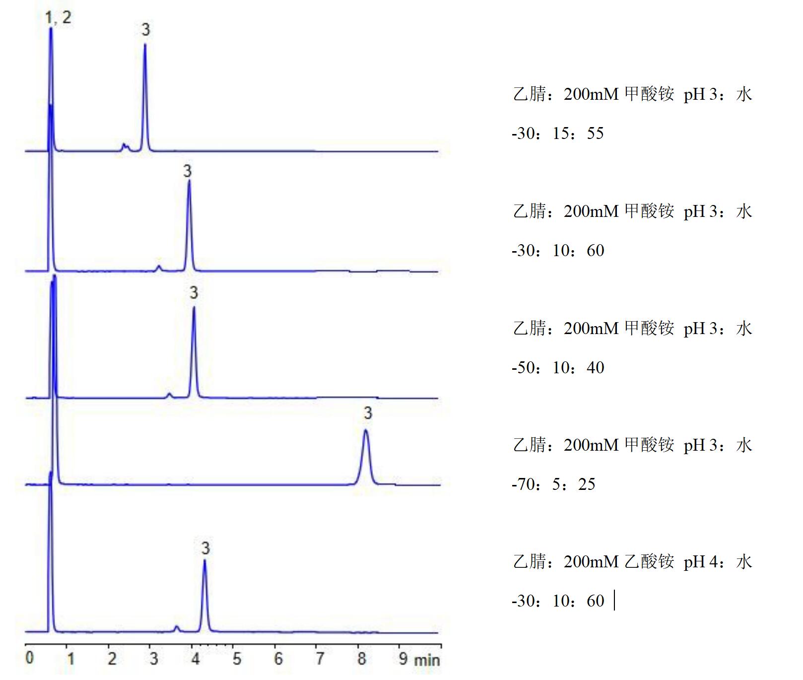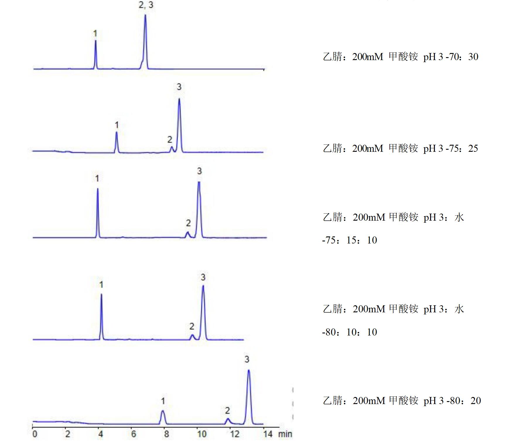 乙腈:200mM 甲酸銨 pH 3:水-30:15:55 乙腈:200mM 甲酸銨 pH 3:水-30:10:60 乙腈:200mM 甲酸銨 pH 3:水-50:10:40 乙腈:200mM 甲酸銨 pH 3:水-70:5:25 乙腈:200mM 乙酸銨 pH 4:水-30:10:60