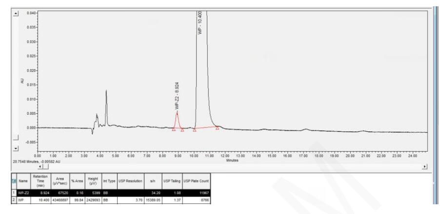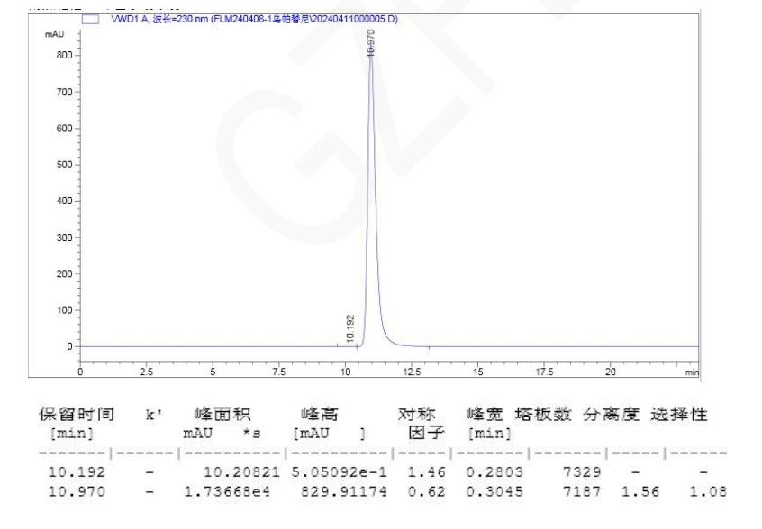 因此,為了確保烏帕替尼手性拆分的準(zhǔn)確性和有效性,建議在專業(yè)的實(shí)驗(yàn)室或藥物研發(fā)機(jī)構(gòu)進(jìn)行,并由具有相關(guān)經(jīng)驗(yàn)和技能的專業(yè)人員操作。這樣不僅可以確保拆分過程的順利進(jìn)行,還可以保證拆分后得到的對映體的純度和活性滿足藥物研發(fā)和生產(chǎn)的需要。 App ID: FLM-B240004 烏帕替尼手性拆分 色譜柱:Chiral MZ(2)-RH 3μ 250*4.6mm (貨號:FMG-AC3-B02-R) 流動相:反相 (詳詢銷售代表) 流速:0.8 mL/min 檢測波長:230nm 柱溫:30℃ 樣品濃度:0.5mg/mL (異構(gòu)體含量約 0.1%以下和異構(gòu)體含量 0.15%) 稀釋劑(乙腈:水-30:70) 進(jìn)樣量:10ul 色譜圖 1:(低于 0.1%限度)
