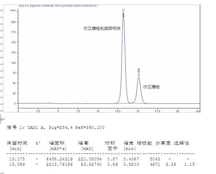 App ID: FLM-B250003 伏立康唑及對映異構體的手性拆分 色譜柱:Chiral INC 5um 150*4.6mm (貨號:FMF-JY5-I03) 流速:1 mL/min 檢測:UV254nm, 25oC 樣品濃度:2mg/mL 進樣量:10 μ 溶劑:水 流動相:反相(咨詢) 色譜圖: