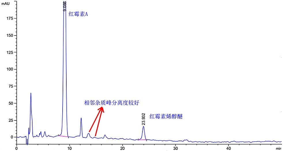 注:該方法要求紅霉素 A 峰與紅霉素烯醇醚峰的分離度應(yīng)大于 14.0,紅霉素 A 峰的拖尾因子應(yīng)小于。