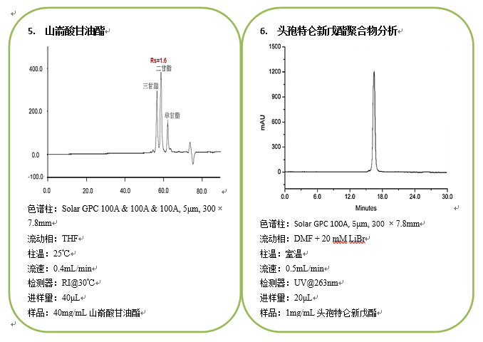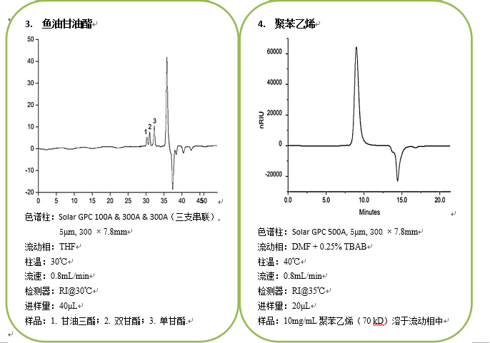 • Solar系列脂溶性GPC/SEC色譜柱 Solar系列體積排阻色譜柱,以高交聯度的聚苯乙烯/二乙烯苯(PS/DVB)顆粒為基質,具有極窄的粒徑和孔徑分布,使分析中保留時間與分子量具有準確的線性關系。高交聯度的多孔顆粒具有優異的化學和物理穩定性,因此在更換有機溶劑時可以使分子量校正曲線的形狀和色譜柱的柱效幾乎保持不變。